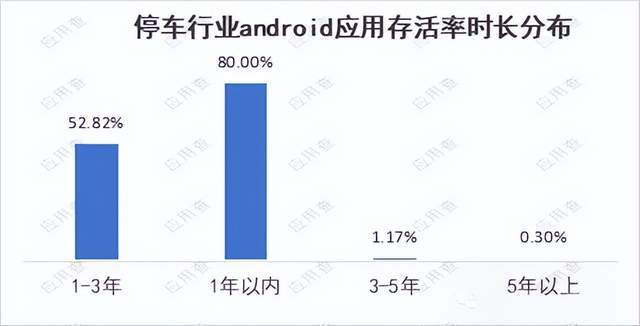 从存在开发者App存活率表现,运营时长“5年以上”和“3-5年”的App存活率超低,运营时长“1-3年”和“1年以内”存活率均超过50%。而运营时长“1-3年”和“1年以内”较高,新进该行业的大多为区域性辅助或共享停车服务的App。如“西宁泊车”、“西安泊车”、“共享停车”。
