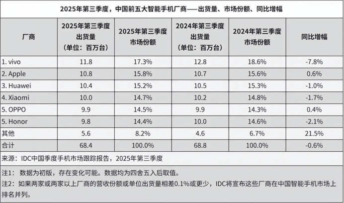 IDC数据显示,2025年第三季度,荣耀重回中国智能手机厂商出货量TOP5,市场份额为14.4%,与OPPO仅相差0.1个百分点。相对于前两个季度的榜上无名,上半年新机的销售的确起到了一定作用。不过同比去年,荣耀第三季度的出货量下降了2.1%,增幅逊色于苹果、小米、华为等品牌。