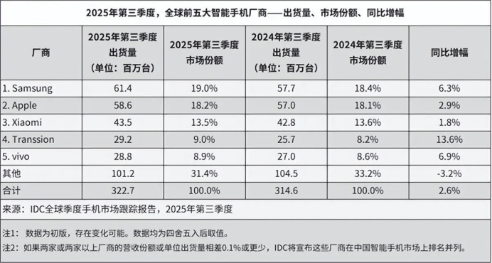 放眼于全球市场,荣耀的处境更加严峻。同样是来自IDC数据,2025年第三季度,三星、苹果、小米、传音和vivo稳居全球出货量前五,其他厂商共享约31.4%的市场份额。结合2024年数据,荣耀手机全球市场份额应该在4%-5%左右,与TOP5有较大差距。考虑到全球市场的复杂性和竞争强度,短时间内突围有难度。