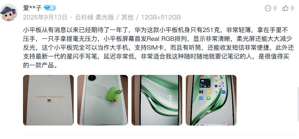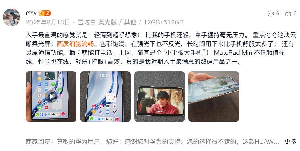 为何华为MatePad Mini如此受追捧?因为它精准满足了用户在移动场景的轻办公、轻学习、随身休闲娱乐等需求。在电商平台上,真实用户的评论,更是能让我们发现它的核心优势:超轻薄设计、沉浸护眼屏幕、独立通信,完美契合“随时需要”的场景。