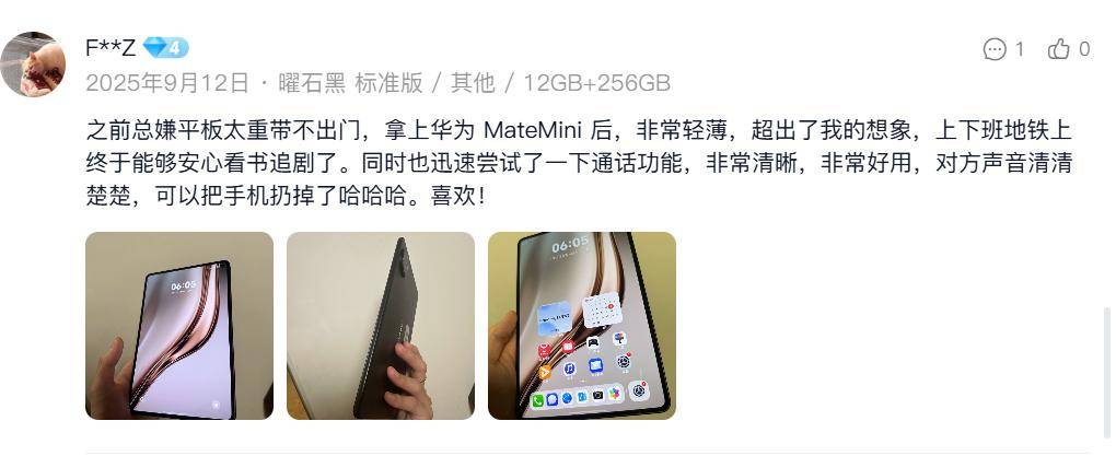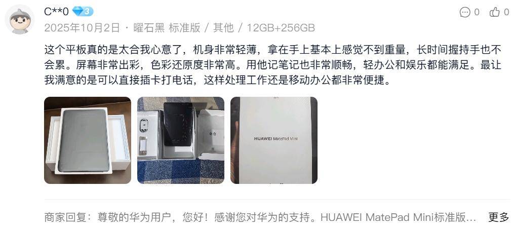 能够插电话卡,独立通信,是华为MatePad Mini的另一大亮点,用户们常在评论中强调其便利。“最让我满意的是可以直接插卡打电话,这样不管是日常通讯还是移动办公都非常便捷。”、“这个平板通信太强了,信号稳定,通话清晰!”有用户评论道。华为MatePad Mini还运用灵犀通信技术,许多人分享在地铁或户外场景下的也有超稳定体验。