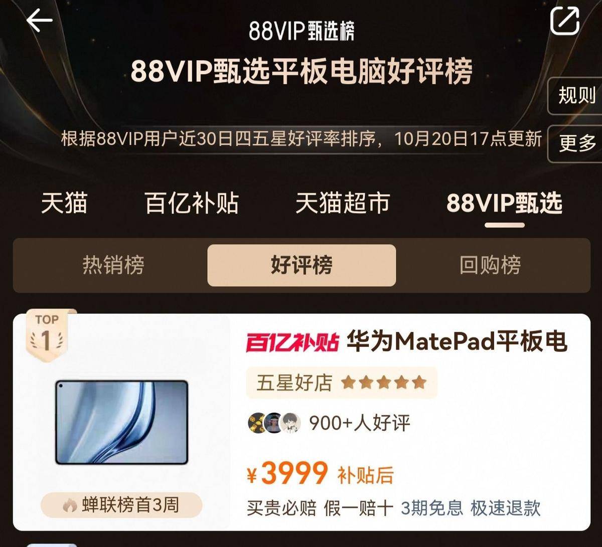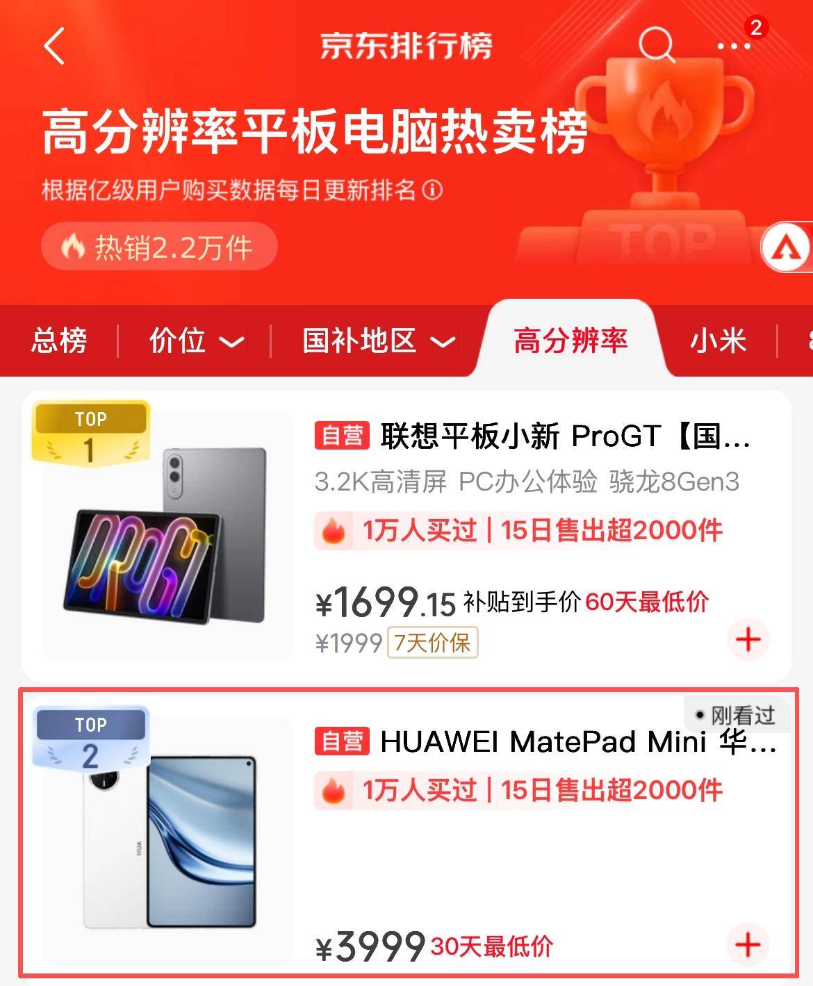 上市即爆款,线上线下热销不断。电商平台数据显示,华为MatePad Mini霸榜多份热销榜单:天猫88VIP甄选平板电脑好评榜top1、热销榜top2,京东高分辨率平板电脑热卖榜top2。线下门店同样火爆,体验区常现排队,导购反馈转化率高。