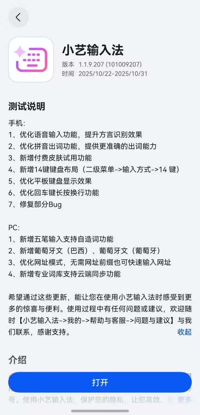 端 1.1.9.207 版本现已上线 键键盘布局、付费皮肤试用等功能,可在应用市场 App 内点击「我的」--「应用尝鲜」下载。
