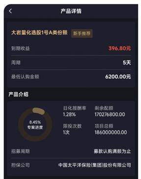 比如,一款名为“大岩量化选股1号A类份额”的产品,最低认购金额为6200元,日化报酬率为1.28%,投资周期为5天,到期收益为396.80元,该产品的担保机构为中国太平洋保险。