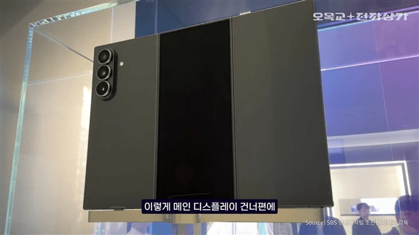 上周三星已经在韩国提前展出了这款手机,虽然是放在玻璃罩内无法上手,但可以确定的是,该机采用 G 字形折叠方案,屏幕分为三部分,左右两块屏幕均向中间屏幕折叠,这与华为 Mate XT 非凡大师的 Z 字形折叠方式明显不同。