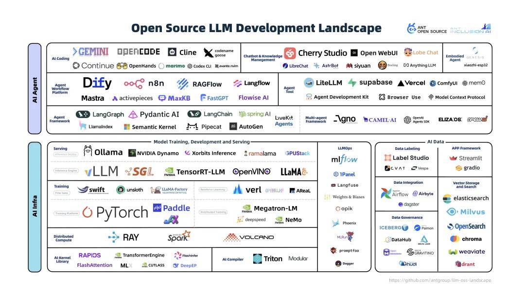 2025年9月,蚂蚁开源和Ant Inclusion AI联合发布《2025年大模型开源开发生态全景图》2.0版本。飞致云旗下的两款开源产品——MaxKB开源企业级智能体平台和1Panel开源面板,凭借在OpenRank影响力评价体系中的出色表现成功入选《2025年大模型开源开发生态全景图》2.0版本,分别进入该全景图的智能体工作流平台和LLMOps分类。