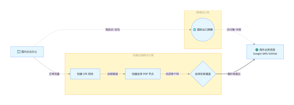 这是悦播出海的核心王牌。相比普通SD-WAN厂商,我们提供专门优化的国际专线服务,真正做到“访问海外像国内一样快”。