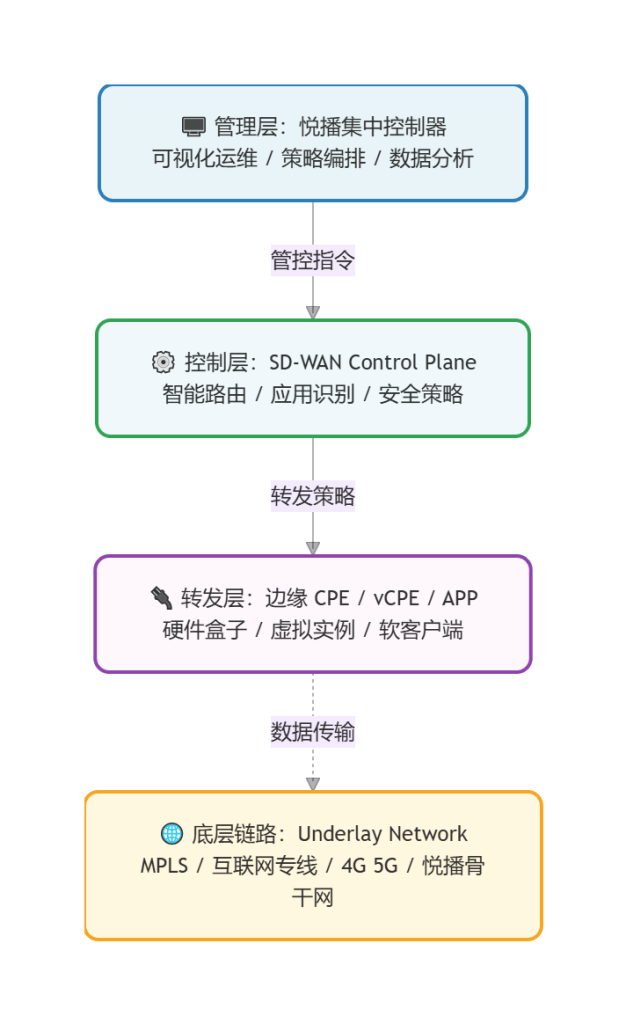 转发层由部署在企业边缘的CPE(客户终端设备)组成,支持硬件盒子、虚拟化实例(vCPE)及纯软件客户端等多种形态,负责流量转发和数据加密。