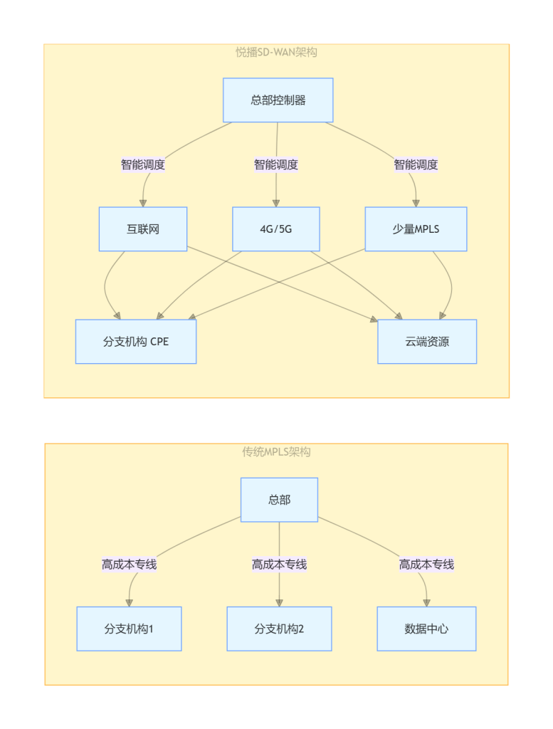采用“MPLS + SD-WAN”混合组网。关键流量走MPLS保障质量,大文件传输走互联网宽带降低成本。