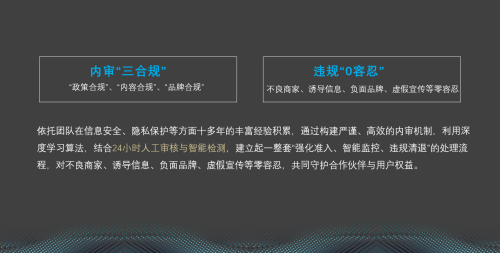 在投放能力上,构建“政策合规、内容合规、品牌合规”三重内审机制,结合深度学习算法与24小时人工+智能双审核,对不良商家、诱.导信息、虚.假宣传等违规行为“0容忍”。从广告主资质审核(营业执照、行业资质、推广产品),到创意素材筛查(广告素材、文案、落地页),再到交易所二次校验(推广内容、渠道匹配度、信用记录),形成全闭环风控,确保广告投放合规安全。同时,AI智能算法实现精准人群画像、智能出价优化、多维度效果追踪,配合全景数据可视化报表,让品牌主实时调整营销策略,实现“高曝光、高转化、低投诉”的营销目标。