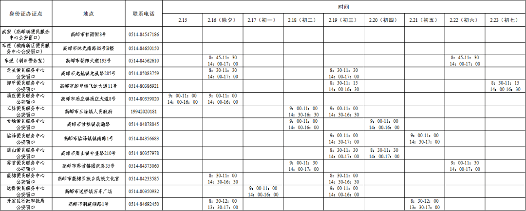 1.线下服务:高邮市民卡办理服务大厅(文游中路110号,大剧院北侧)服务时间为2月16日(除夕)8:00-15:30、2月18日(正月初二)-2月23日(正月初七)上午9:00-11:00,下午14:00-16:00,受理公交卡和充值业务。