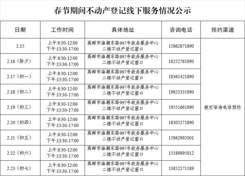 春节期间,可通过江苏政务服务在线平台、我的扬州APP、高邮不动产公众号等渠道进行档案查询、业务查询。