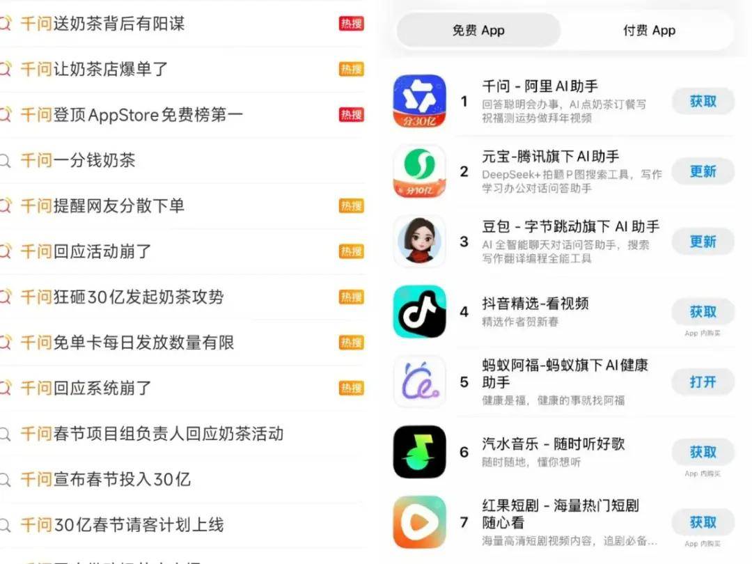 根据千问官方数据显示,该活动上线万单。霸榜多个微博热搜同时,千问APP一度登顶AppStore免费下载榜榜首,超过前两天狂撒10亿红包的腾讯元宝。