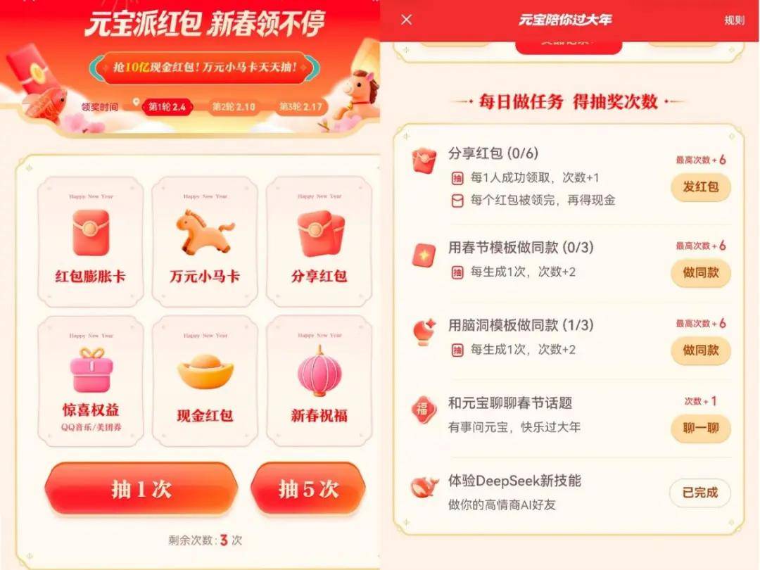 2月初,腾讯元宝以 10 亿红包切入微信社交场景,采用 “分享抽奖、邀友加码” 的裂变玩法,试图复刻当年微信红包的传播效应。