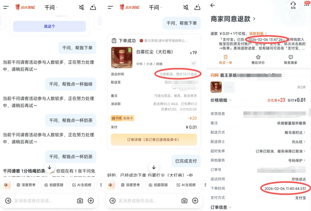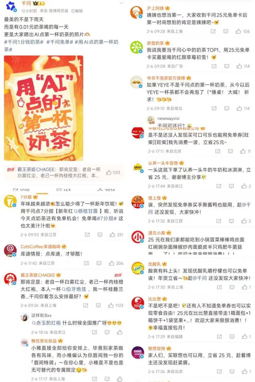 率先上线亿免单活动集中引爆了舆论场,尤其以AI点奶茶、免单消费等场景,快速建立了“上千问,AI一键下单”的用户心智。