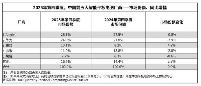 IDC 报告:2025 年中国平板电脑市场出货量 3376 万台同比增长 13.1%,华为、苹果、小米前三
