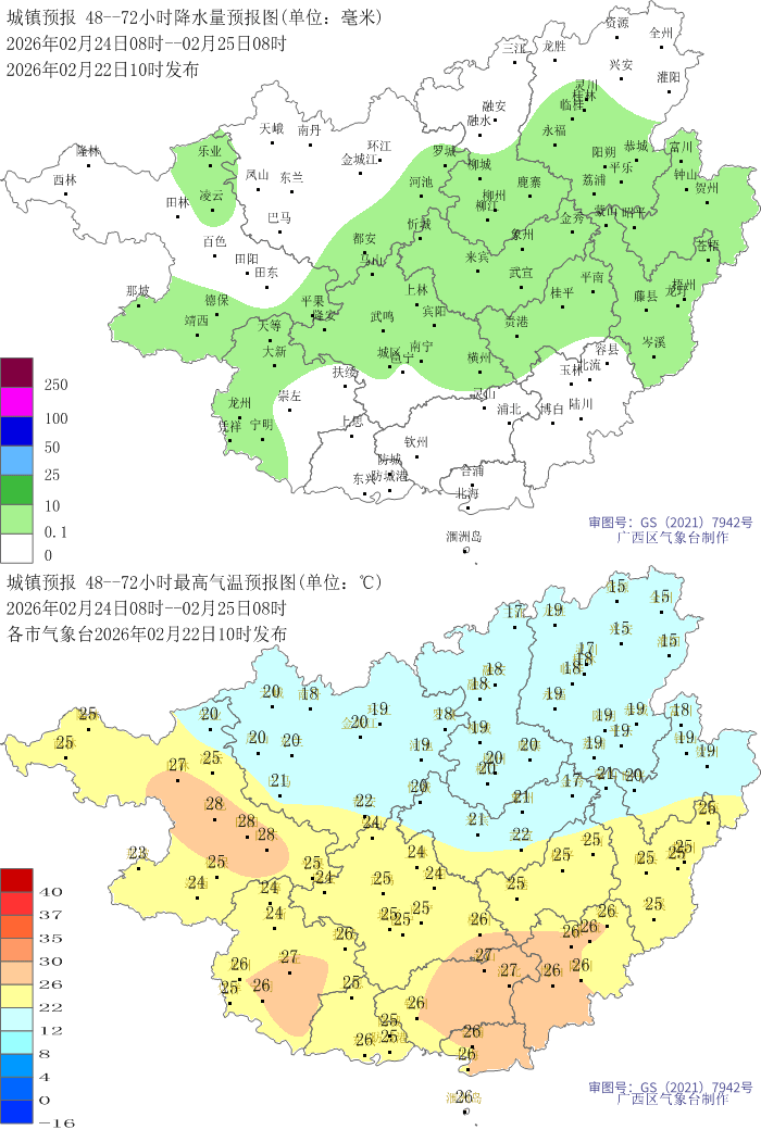 24日晚上到25日白天,桂北、桂西阴天有小雨、局地中雨,其他地区多云到阴天有分散小雨。最低气温:桂东北8~15℃,其他地区14~20℃。