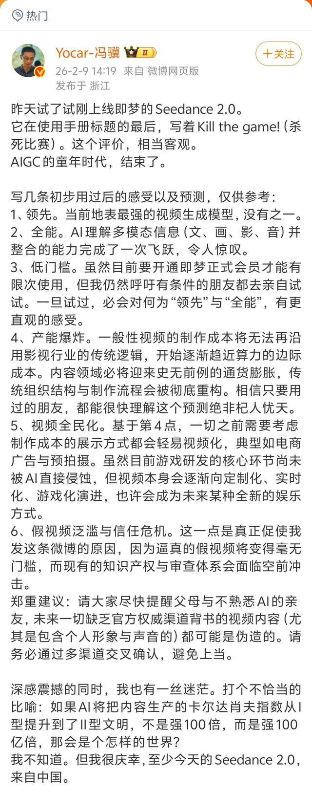 更让行业震动的,是Seedance 2.0的发布。经此一役,市场普遍认为,视频生成的可控性,第一次被拉到了可以工业化应用的水平。《黑神话:悟空》的制作人冯骥则是给了一句很重的评价:“AIGC的童年时代,结束了。”