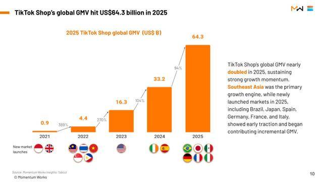 同时,在海外,抖音电商交出了一份更激进的成绩单。据新加坡风投机构Momentum Works联合视频商务数据平台Tabcut披露的数据,TikTok Shop 2025年全球GMV达到643亿美元,折合人民币约4444亿,同比暴涨94%。