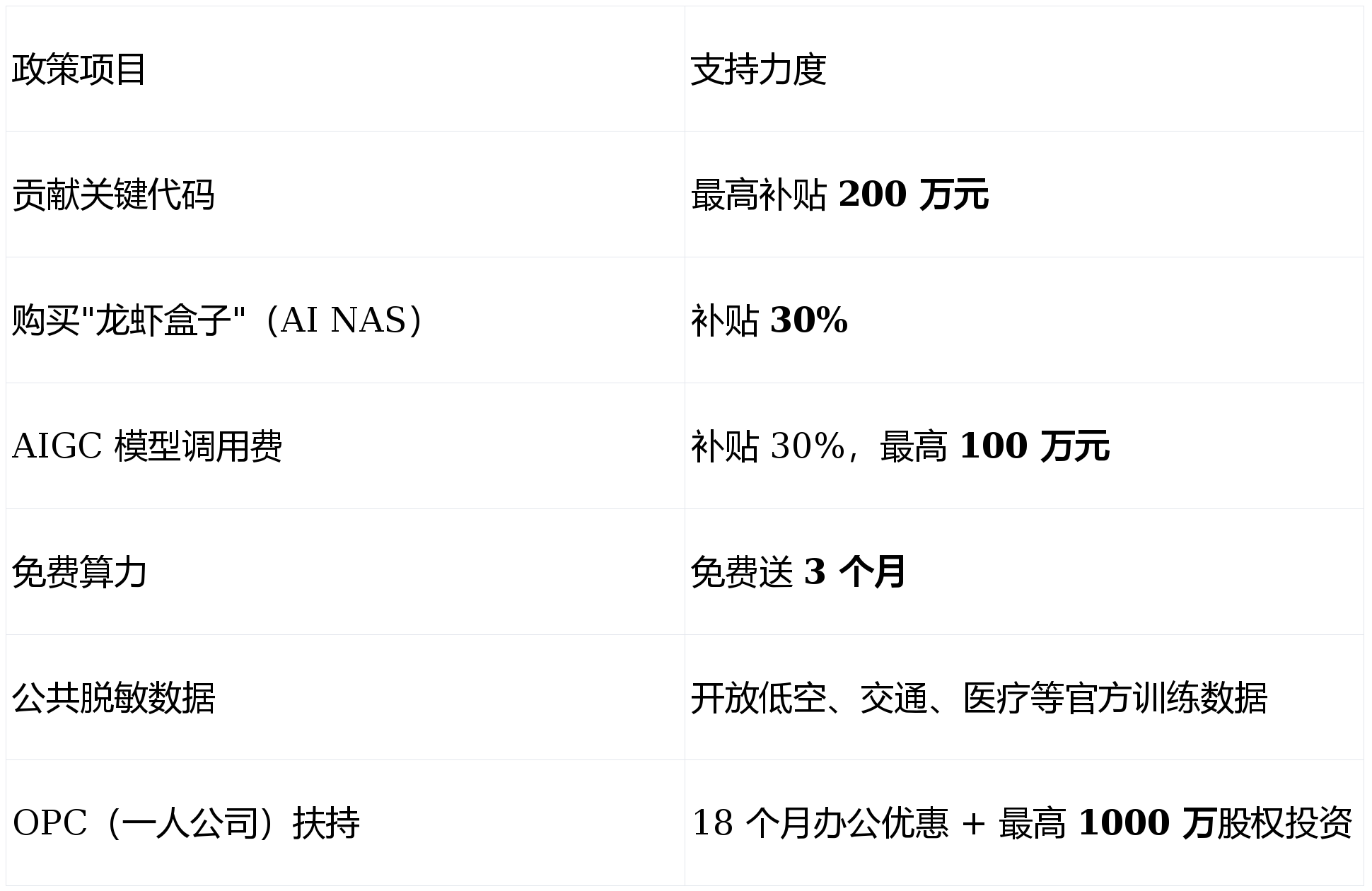 值得关注的是,政策中极具前瞻性地圈出了OPC(一人公司)概念——这是全球首个针对AI + 一人公司的实质性扶持,为个人创业者打开了一扇史无前例的政策之门。