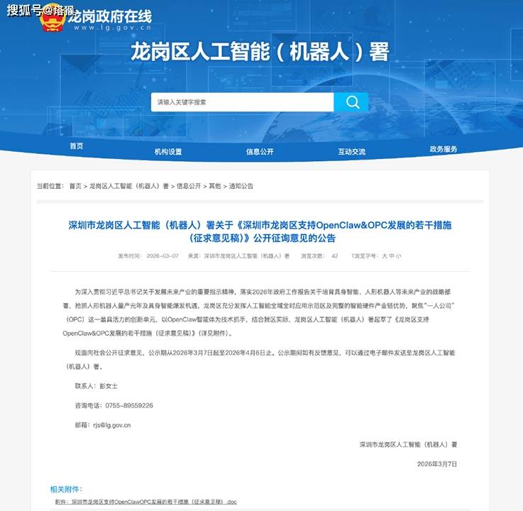 3月7日,深圳市龙岗区人工智能(机器人)署率先发布了全国首个针对 OpenClaw 生态的系统性政策——《支持 OpenClaw & OPC 发展的若干措施(征求意见稿)》,被称为龙虾十条。