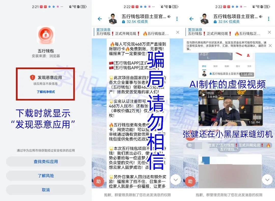 宣称实名认证注册就可免费领取468万奖励,但App下载时却被提醒为恶意应用,群内宣传的视频也是AI痕迹明显。千万别信!兑现只是骗子的谎言,后续就是打着各种名义,什么工本费、认证费等等,让大伙先掏钱。