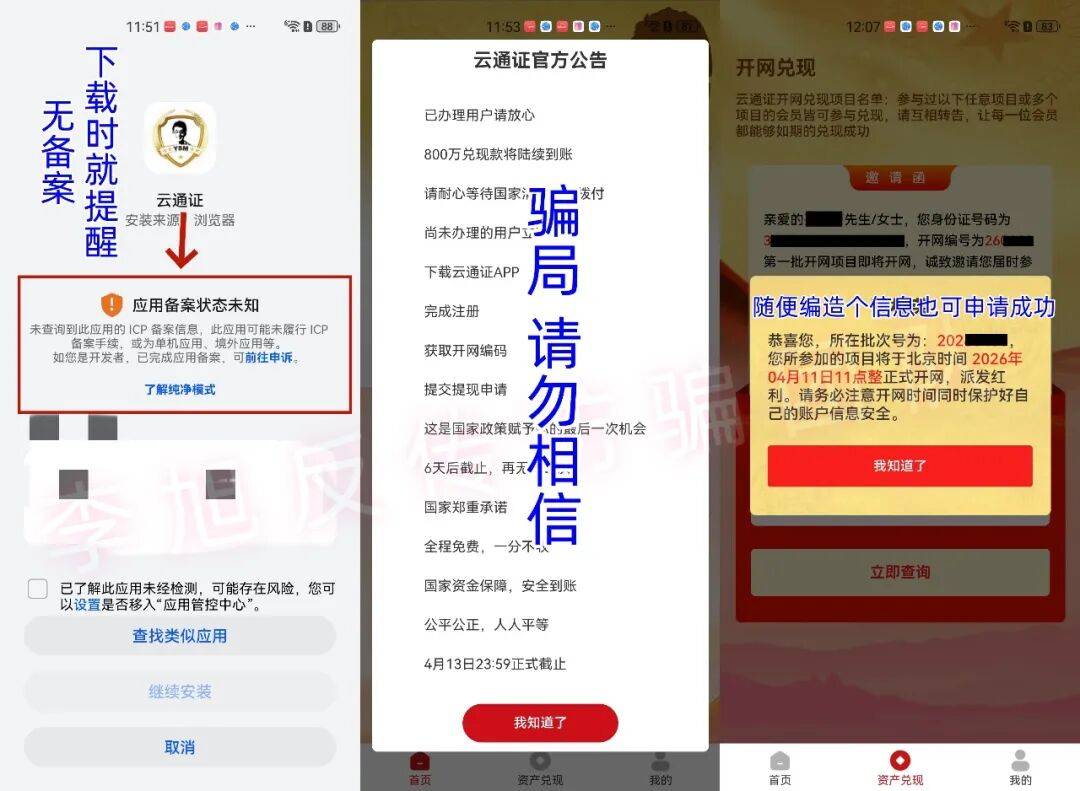最主要的是,我们查询发现,为了让骗局看起来更真,该App伪造正规公司在网上公开的备案信息,让大伙以为这是个有备案的软件,实则备案号与网址完全不符,下载时候就会提示未备案。