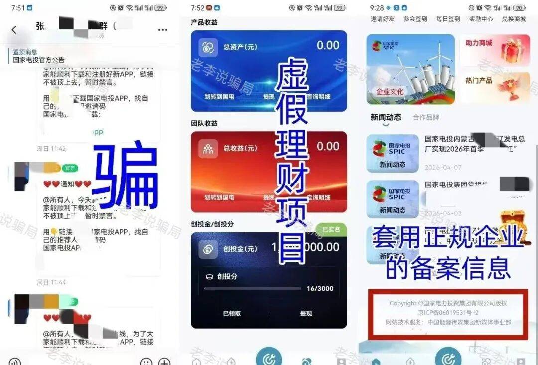 该App假冒国家电力投资集团有限公司,号称实名注册就送100万元创投金,邀请新人还有额外奖励。骗子通过线上会议洗脑、用小额红包激励大伙发展下线,然后诱导大家提交详细身份信息,甚至上传手持身份证照片。