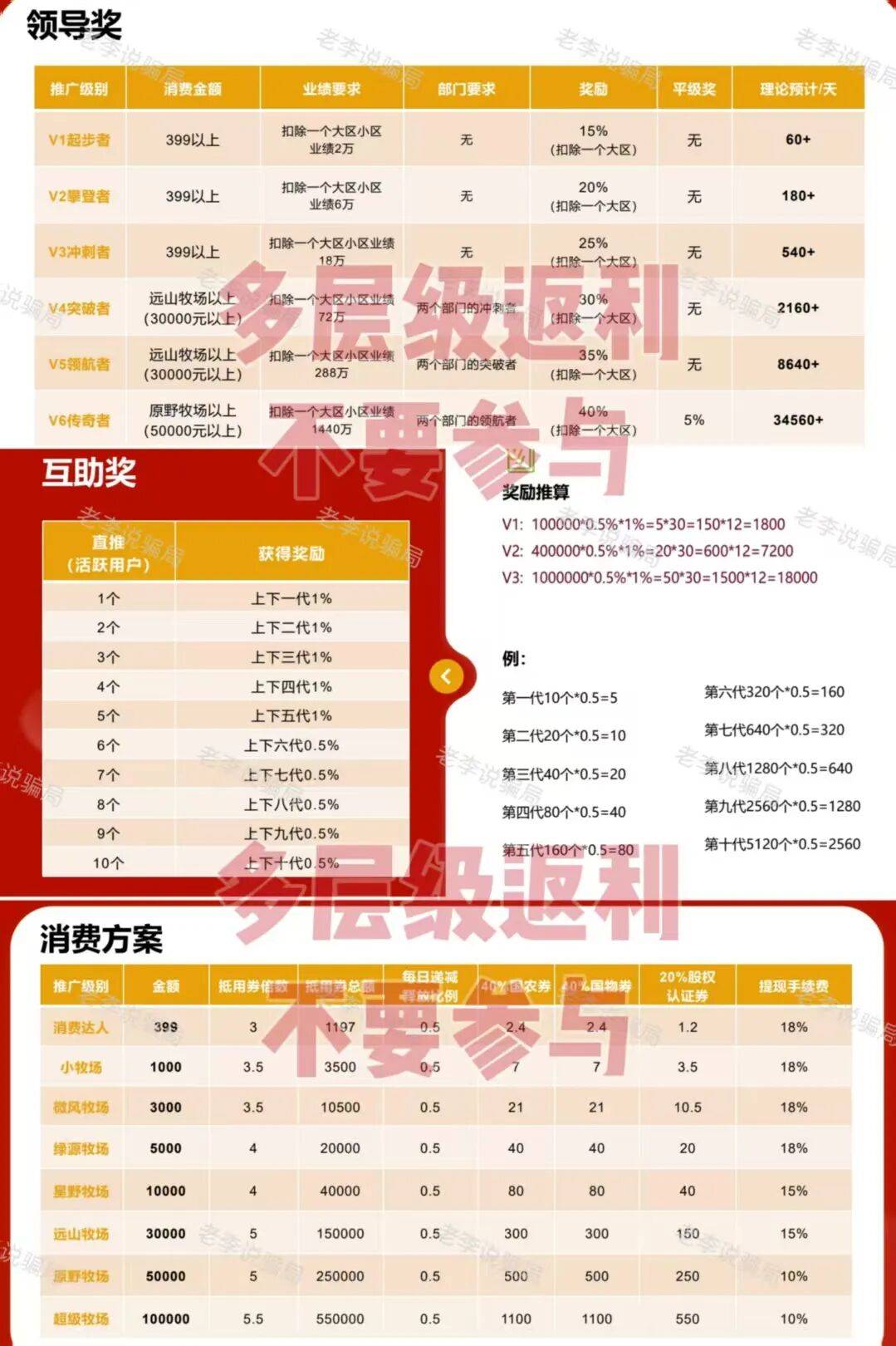 从模式来看,这个项目同时具备了“缴入门费”、“拉人头”、“团队计酬”这传销的三大特征。它所谓的农产品销售只是个幌子,只是迟早的事,请大家务必远离。