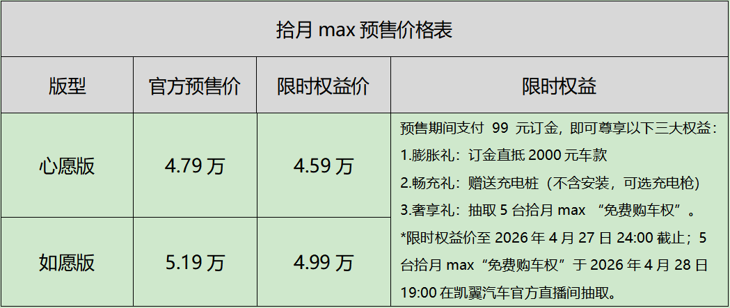 *限时权益价至2026年4月27日 24:00截止;5台拾月max“免费购车权”于2026年4月28日19:00在凯翼汽车官方直播间抽取。