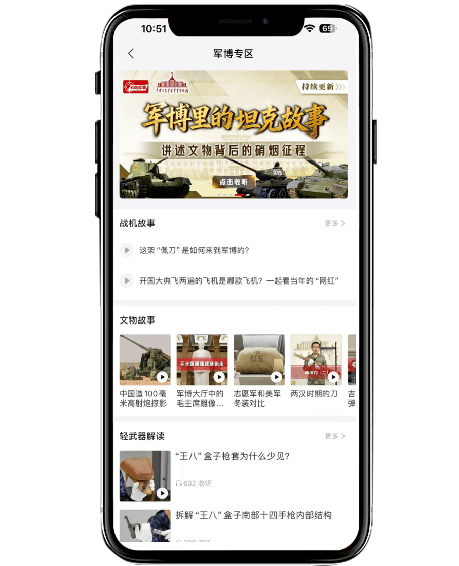 “军事博物馆”专区精心打造五大特色专辑,以短视频的节目样态,全方位、多角度呈现军博馆藏的精彩故事、历史价值与精神内涵。