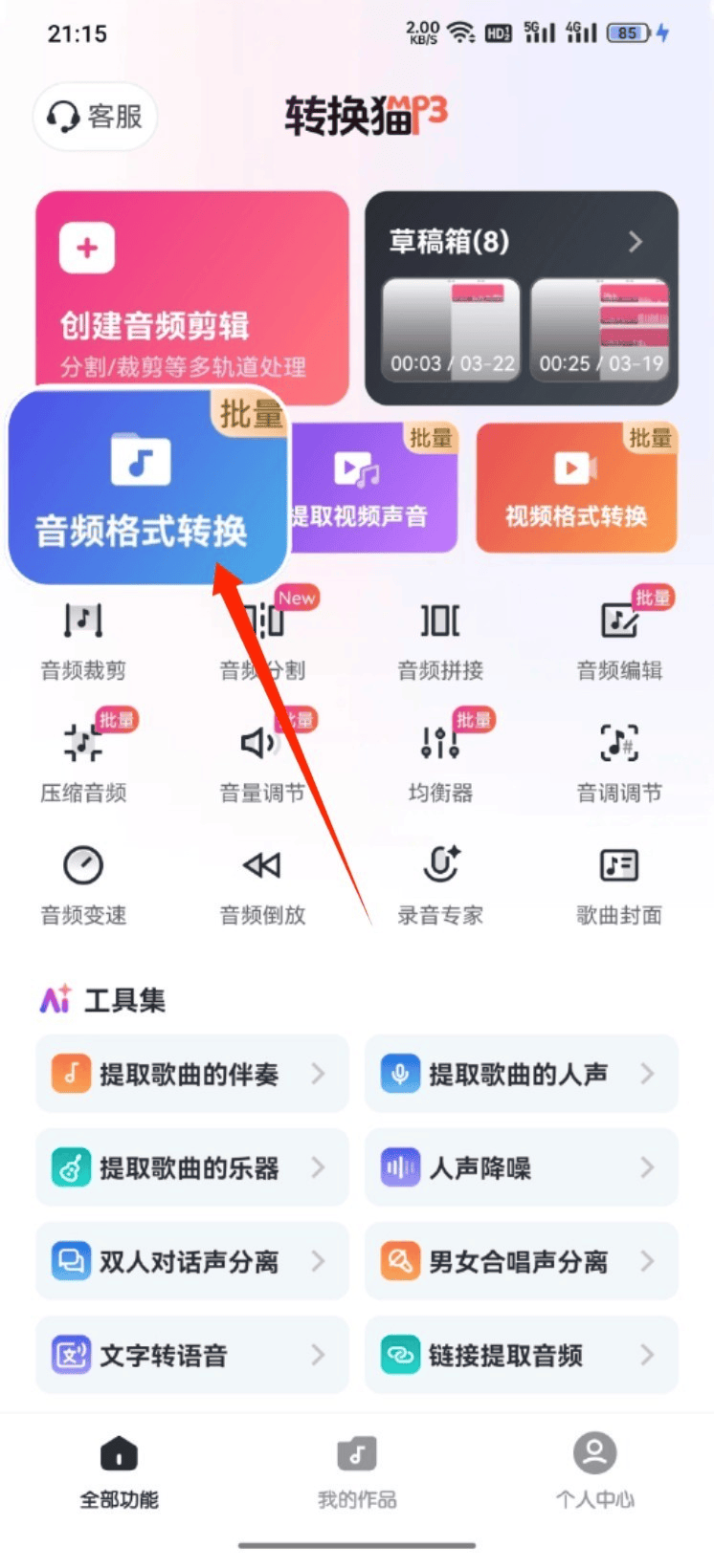 第一步在手机应用商店搜索转换猫,下载并安装App。打开后进入首页,找到音频转换功能入口,点击进入。