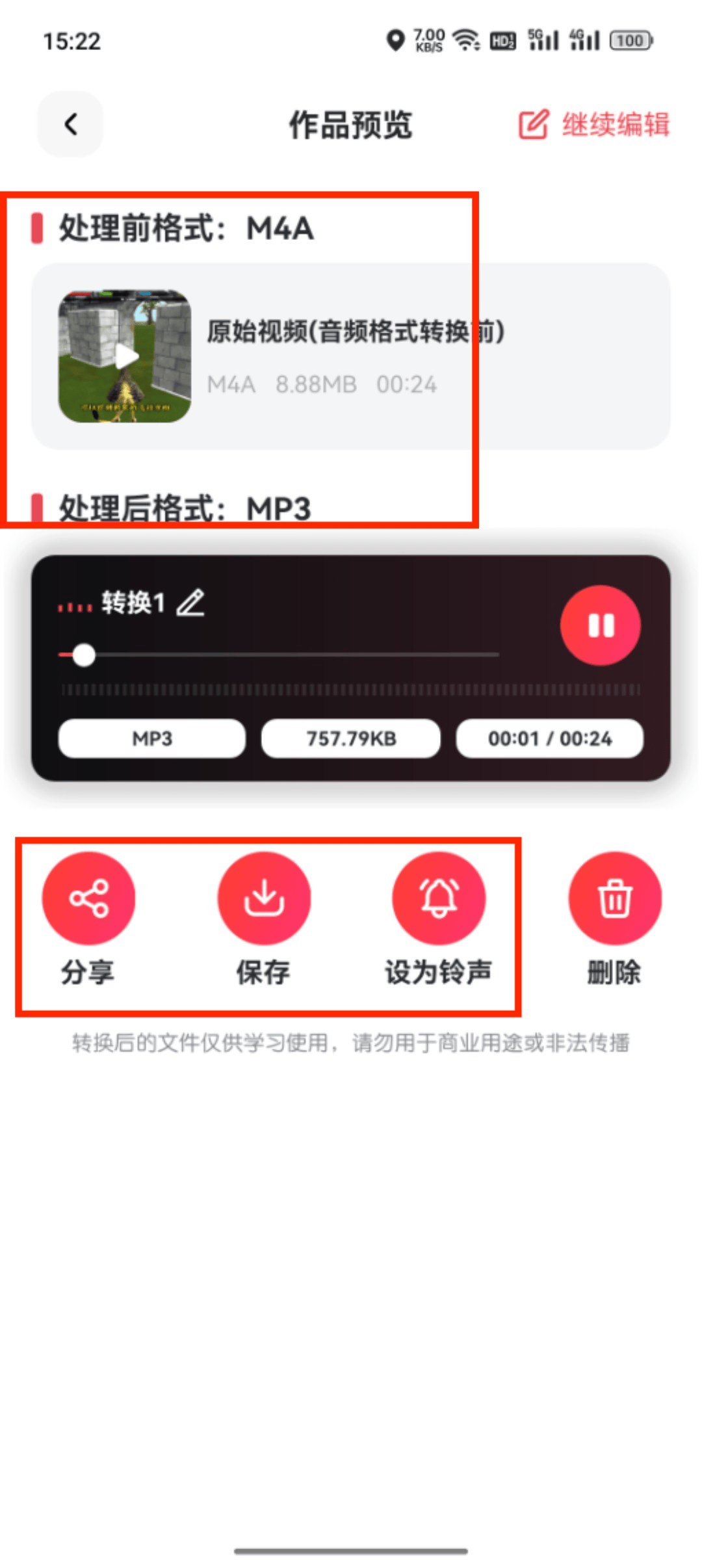 第三步文件添加完成后,在输出格式中选择MP3并设定音质参数。确认无误后点击开始转换,转换完成后可以直接在App内播放试听,也可以一键分享到其他应用或保存到指定位置。