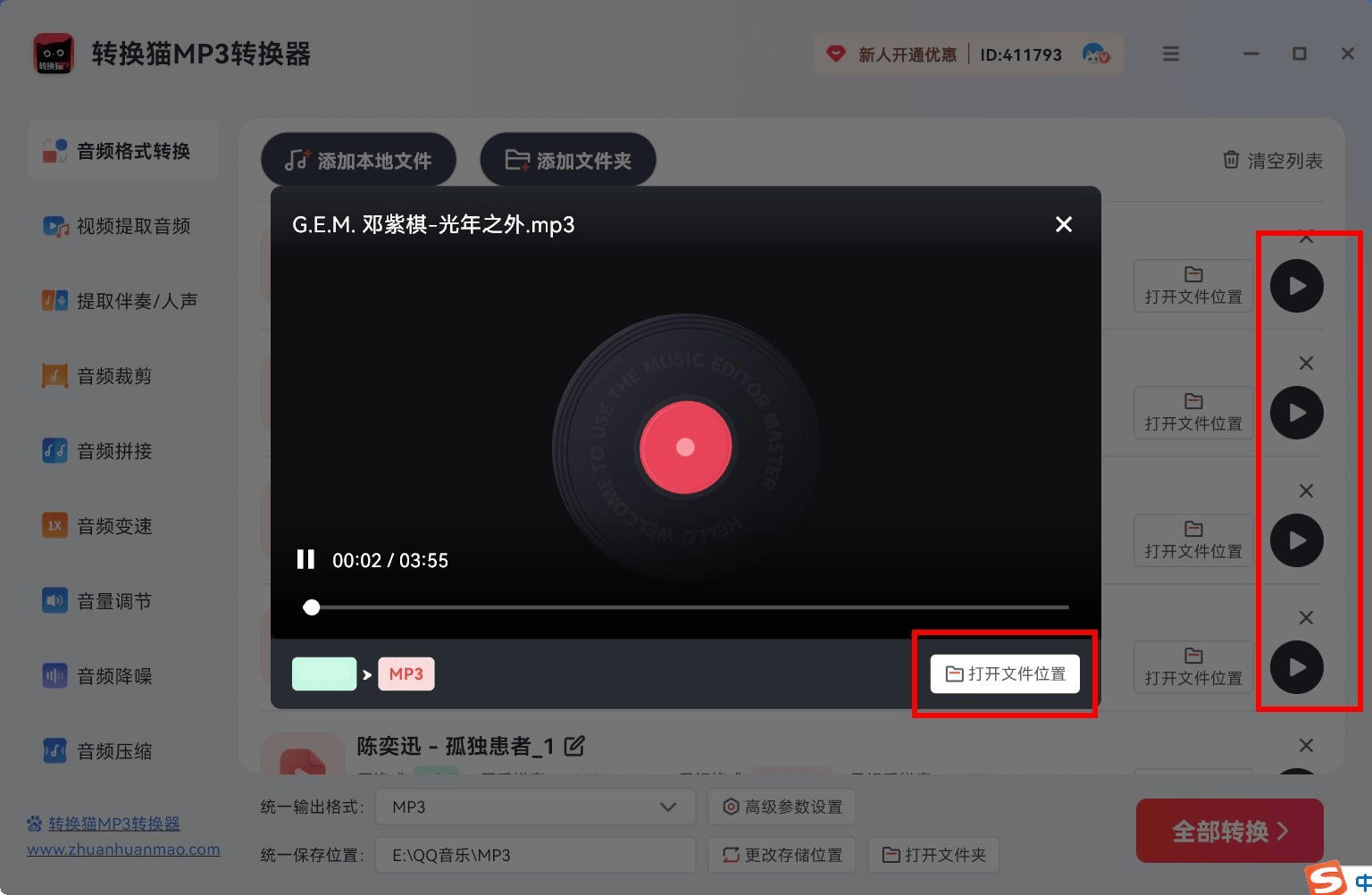 第三步在输出格式中选择MP3,可以根据需要调整比特率,通常选择192kbps或320kbps即可保证良好音质。设置好输出目录后,点击全部转换按钮,软件会自动完成格式转换,转换完成后会提示保存位置。