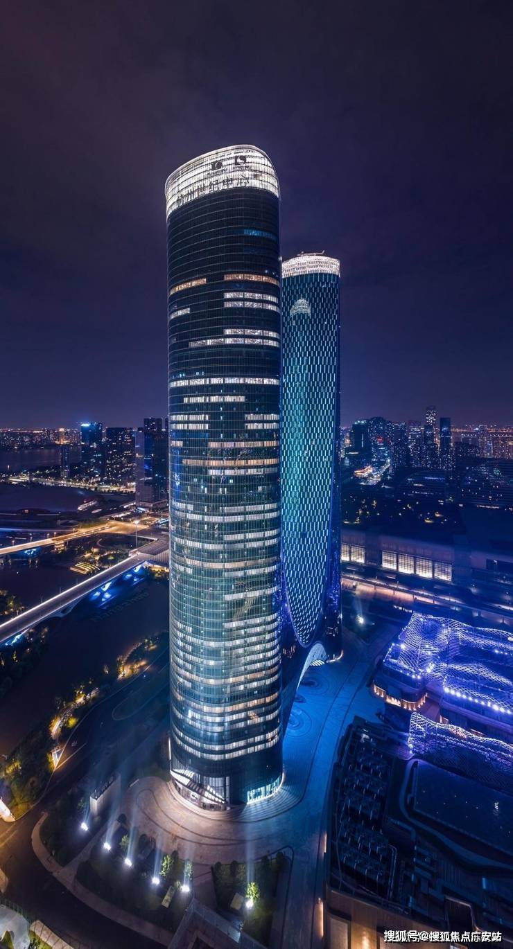 项目总建筑面积53.3万平方米,主体由对称的63层东西双塔组成,建筑高度302.6m,是集企业总部、综合商务、星级酒店、精品商场等功能为一身的综合体