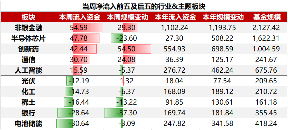行业&主题板块ETF中,净流入前五大板块依次为:非银金融、半导体芯片、创新药、通信、人工智能;净流出前五大板块依次为:电池储能、银行、稀土、化工、光伏。