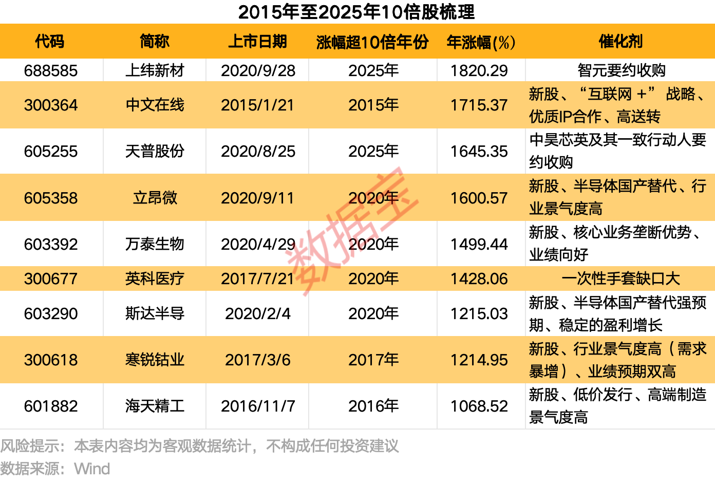为何能成为10倍股?笔者分析发现,10倍股具备三大催化剂,其一,新股属性是主要特征。比如2015年1月21日上市的中文在线倍;万泰生物、斯达半导均于2020年上市,当年2家公司股价涨幅均超过12倍。