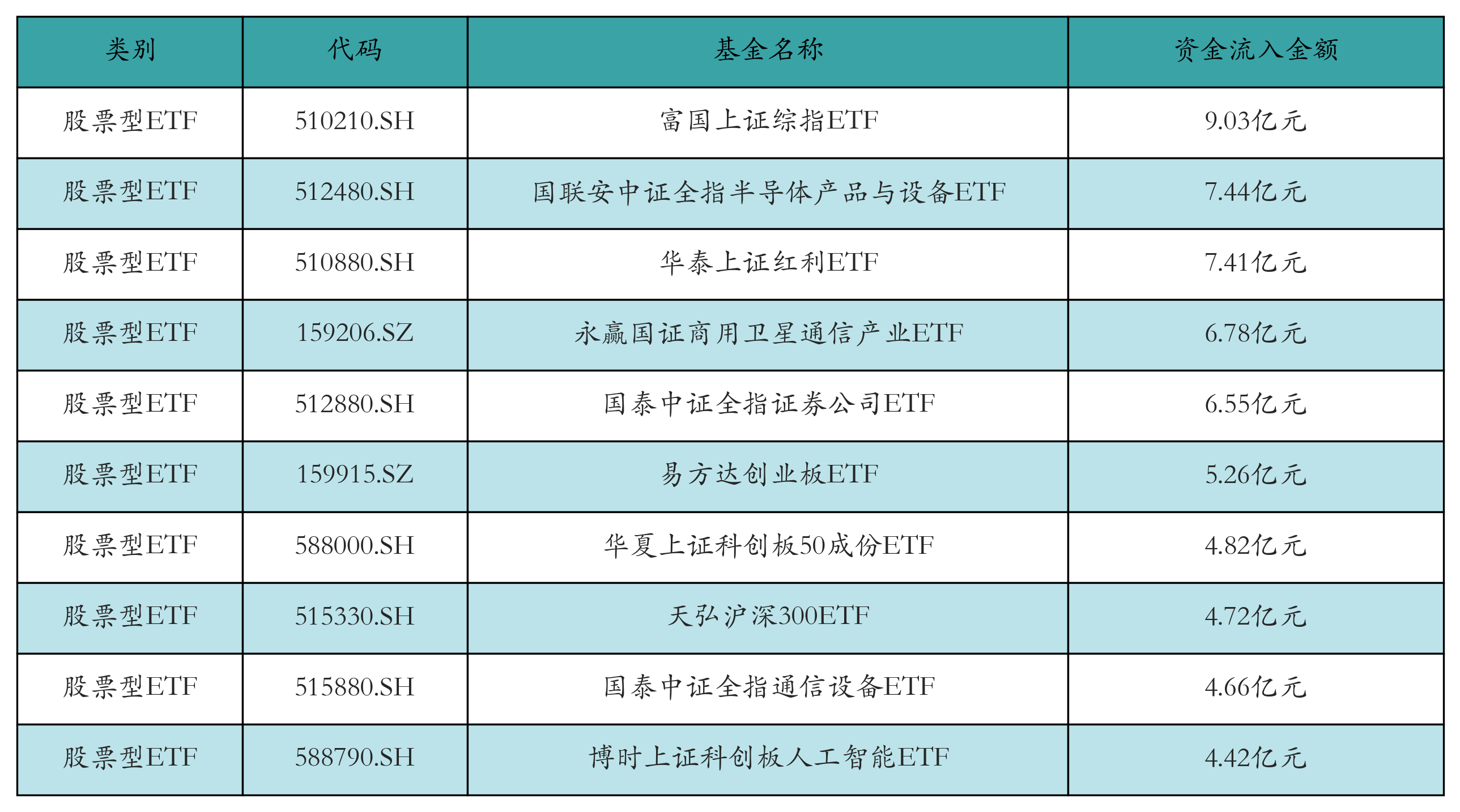 昨日股票型ETF资金流入最多的3只ETF及其流入金额分别为:富国上证综指ETF(流入9.03亿元)、国联安中证全指半导体产品与设备ETF(流入7.44亿元)、华泰上证红利ETF(流入7.41亿元)。资金流入前10详情见下表: