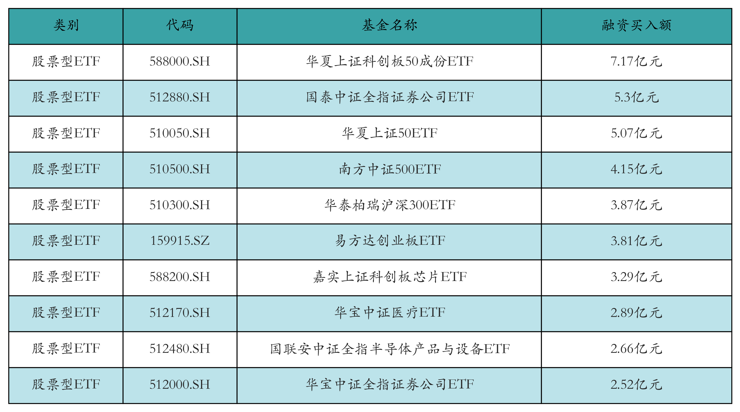 昨日股票型ETF融资买入额最高的3只ETF及其买入金额分别为:华夏上证科创板50成份ETF(7.17亿元)、国泰中证全指证券公司ETF(5.3亿元)、华夏上证50ETF(5.07亿元)。融资买入额前10详情见下表: