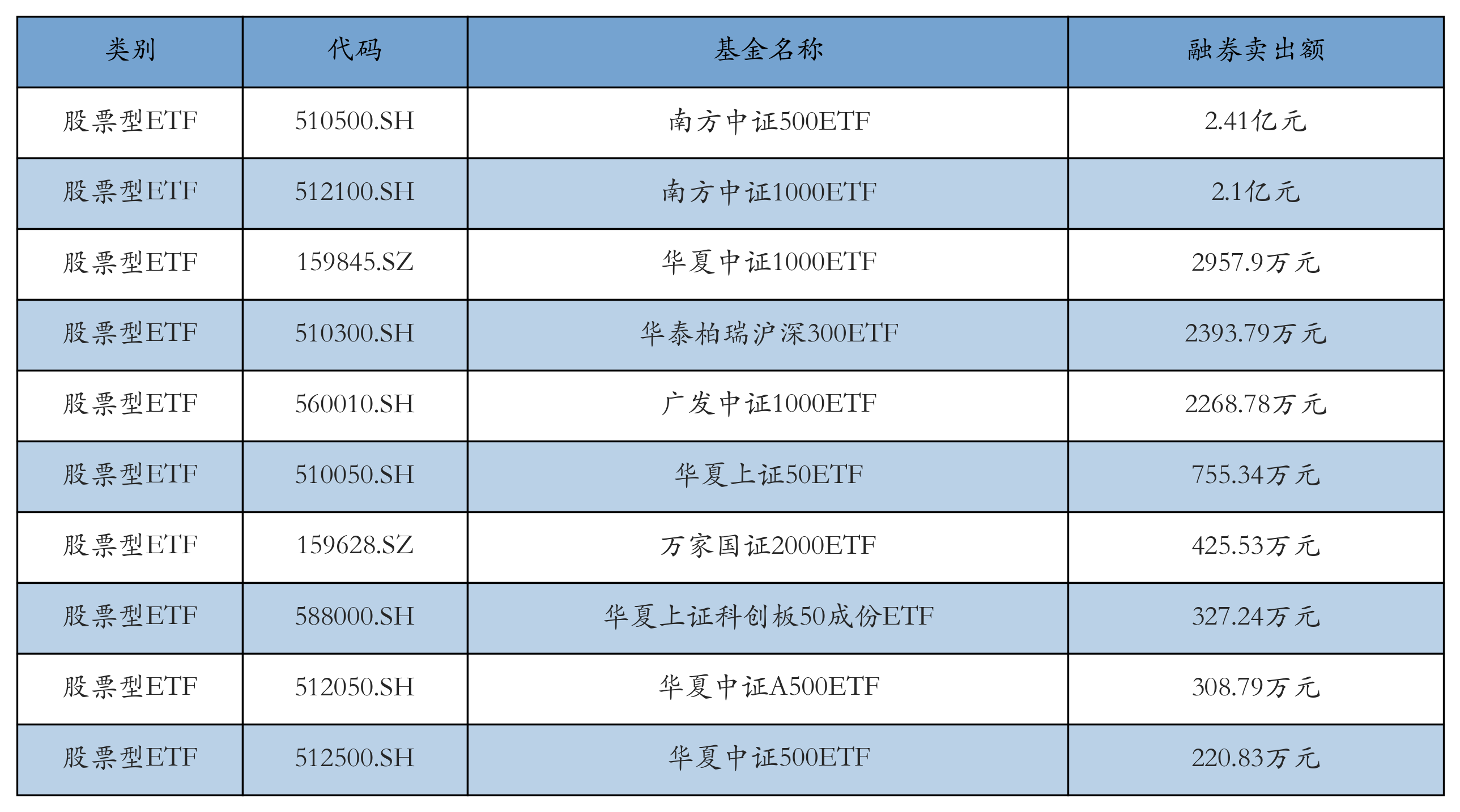 昨日股票型ETF融资卖出额最高的3只ETF及其卖出金额分别为:南方中证500ETF(2.41亿元)、南方中证1000ETF(2.1亿元)、华夏中证1000ETF(2957.9万元)。融券卖出额前10详情见下表: