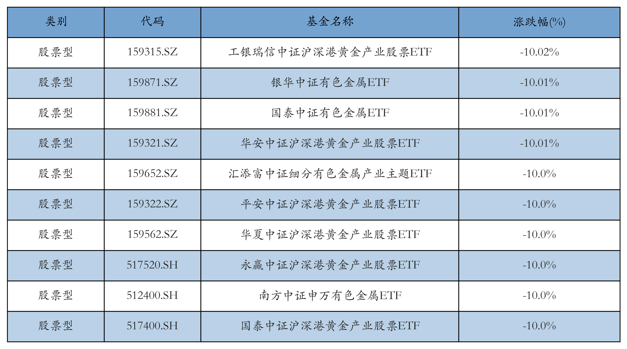 昨日股票型ETF跌幅最大的3只ETF及其收益率分别为:工银瑞信中证沪深港黄金产业股票ETF(-10.02%)、银华中证有色金属ETF(-10.01%)、国泰中证有色金属ETF(-10.01%)。跌幅前10详情见下表: