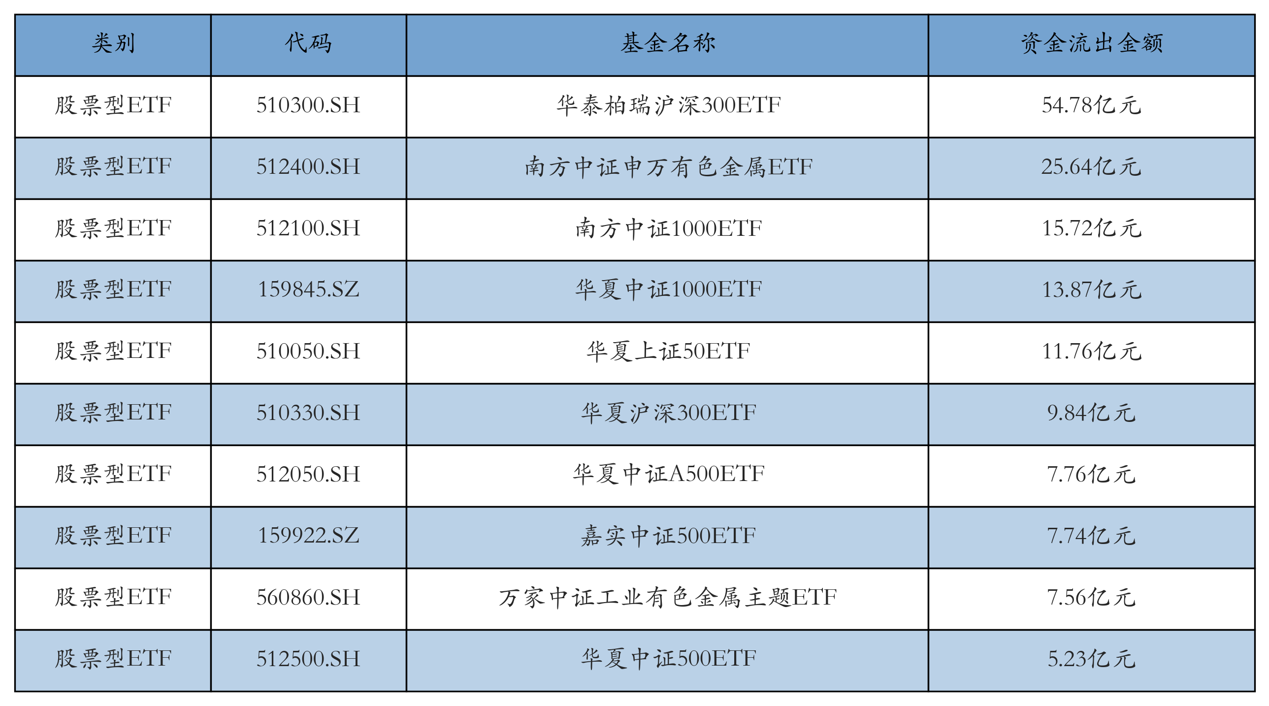 昨日股票型ETF资金流出最多的3只ETF及其流出金额分别为:华泰柏瑞沪深300ETF(流出54.78亿元)、南方中证申万有色金属ETF(流出25.64亿元)、南方中证1000ETF(流出15.72亿元)。资金流出前10详情见下表: