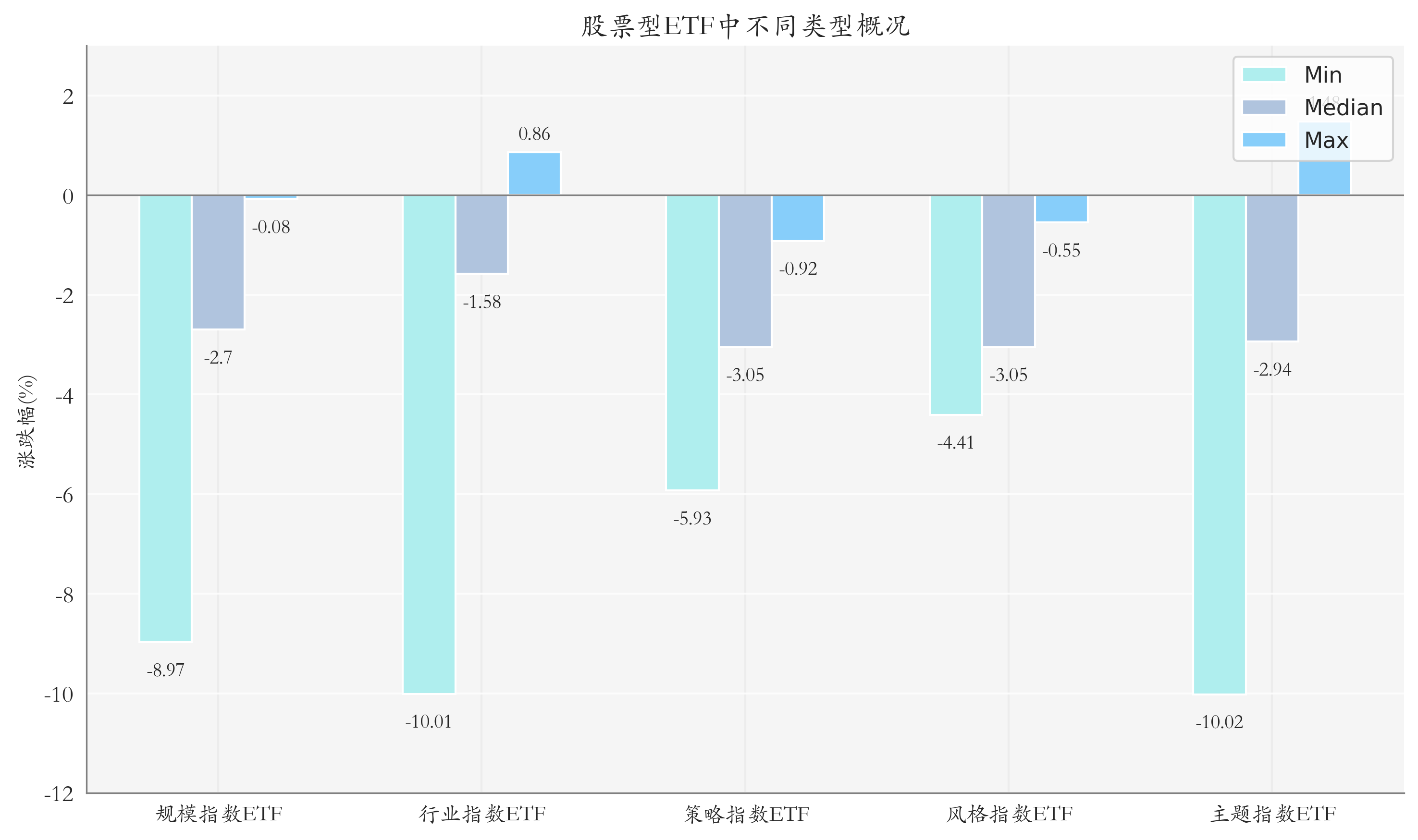 昨日股票型ETF收益率中位数为-2.77%。其中按照不同分类,规模指数ETF中融通深证100ETF收益率最高,为-0.08%;行业指数ETF中华宝中证细分食品饮料产业主题ETF收益率最高,为0.86%;策略指数ETF中南方标普中国A股大盘红利低波50ETF收益率最高,为-0.92%;风格指数ETF中招商中证银行AH价格优选ETF收益率最高,为-0.55%;主题指数ETF中鹏华中证酒ETF收益率最高,为1.48%。