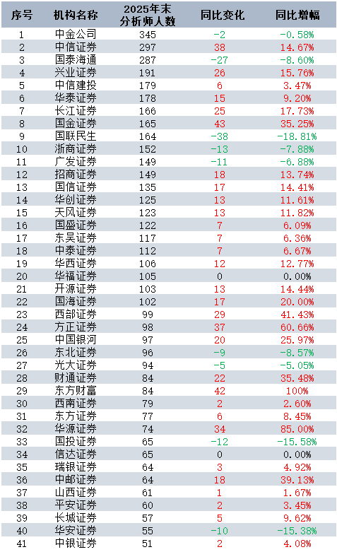 国金证券凭借着全年43人的增员,成为2025年分析师增长最快、人才吸引力最为突出的机构,年末分析师人数达到165人,同比增长35.25%。公司分析师人数排名也从2024年末的第12名上升至2025年末的第8名。