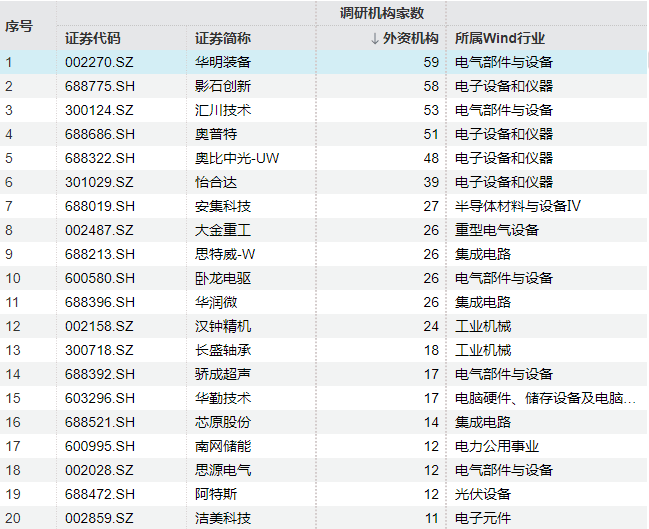 从调研个股来看,今年以来截至2月25日,华明装备获得59家外资机构调研,在所有个股中排名首位;影石创新、汇川技术、奥普特也均获得50家以上外资机构调研。此外,怡合达、安集科技、大金重工、思特威、卧龙电驱、华润微等个股获得20家以上外资机构调研。