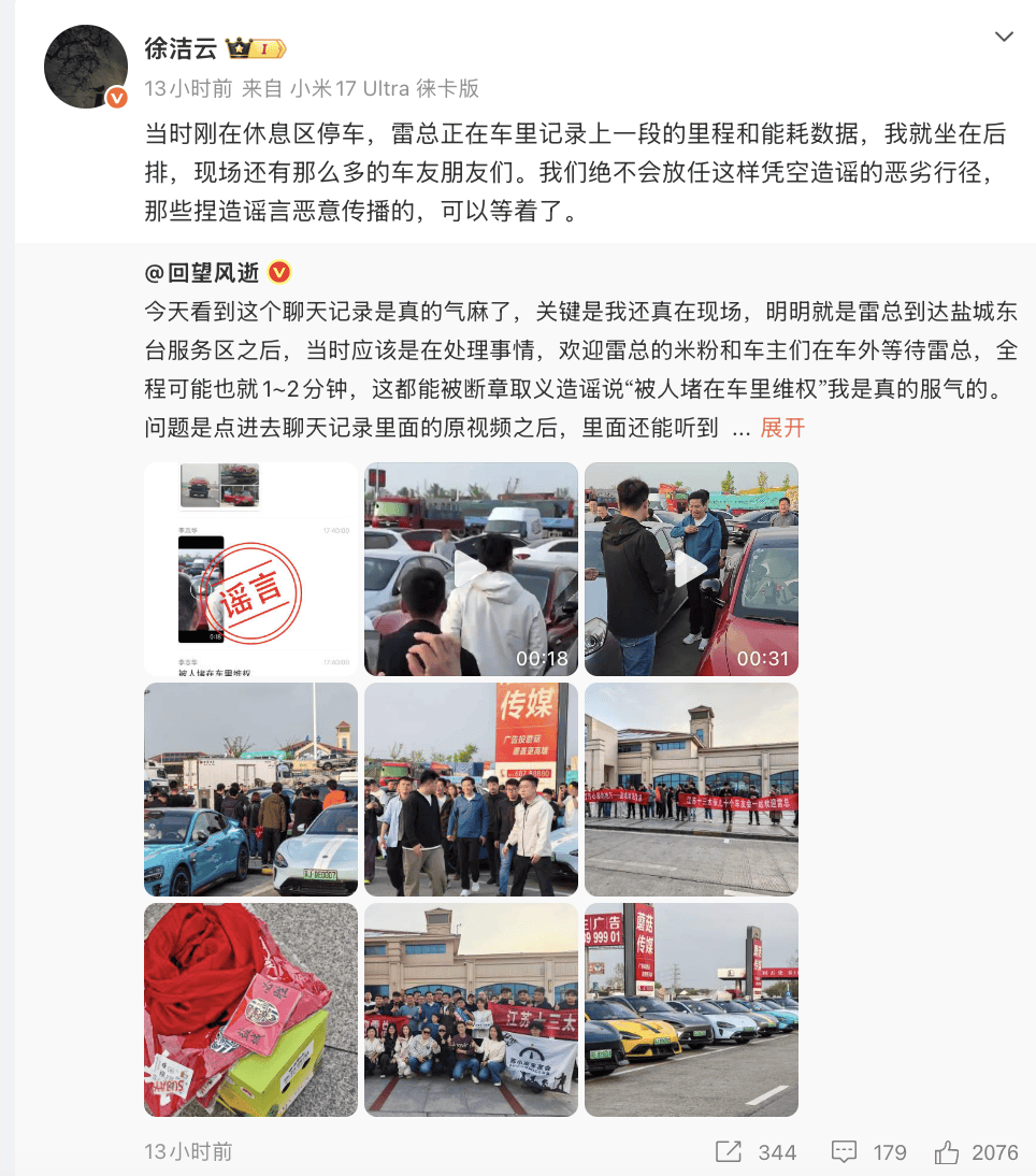 根据微博博主 @回望风逝 发文,雷军当时到达盐城东台服务区之后,应该是在处理事情,欢迎雷军的米粉、车主在车外等待,全程可能就 1-2 分钟。但最终还是被人断章取义造谣说“被人堵在车里维权”。