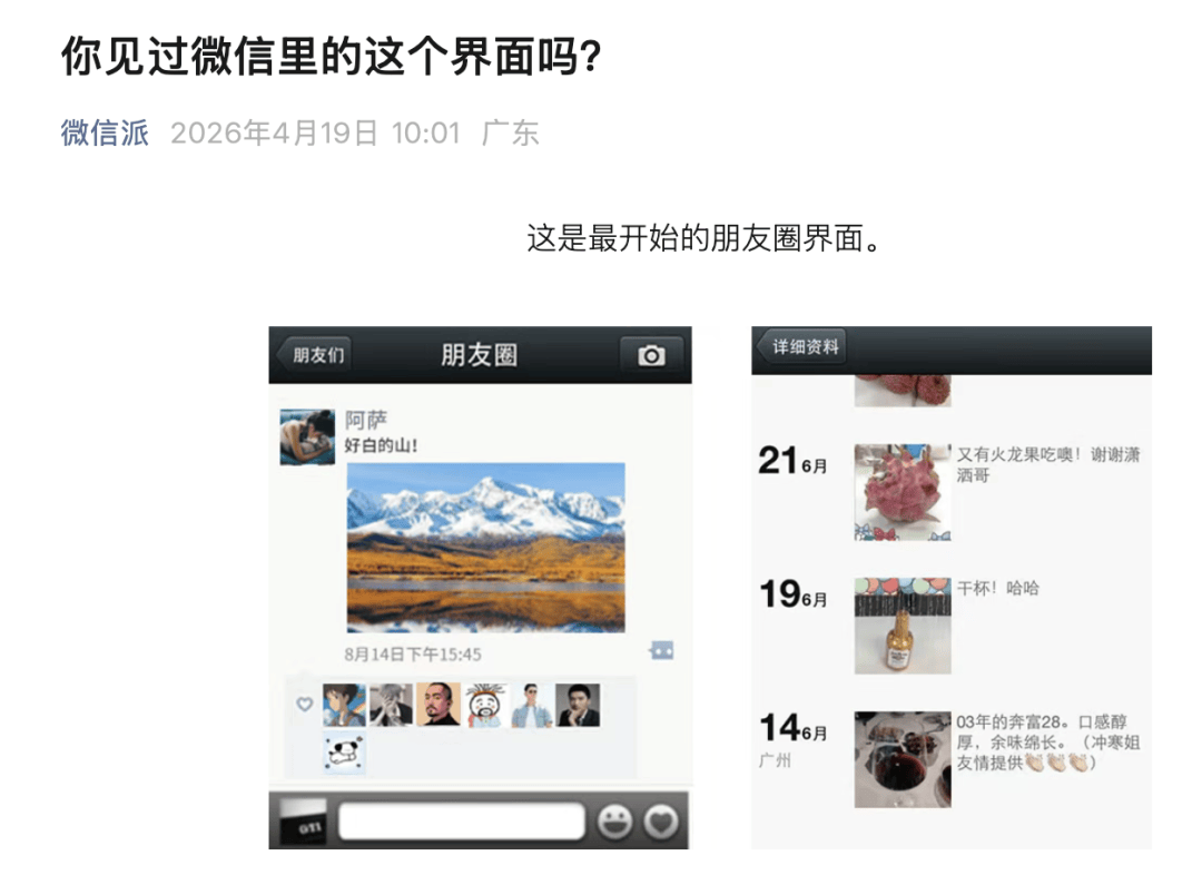 昨日是微信朋友圈上线 周年的日子,“微信派”分享了朋友圈背后的故事。据其透露,朋友圈上线 个英文字母用完,只能用别的符号接着标。官方还透露,发纯文字早期只是一个供内部测试的功能。因为发文字需要经过思考和编辑,但发照片或视频容易很多。现在,内测的小彩蛋变成了大家默认的操作。(微信派)