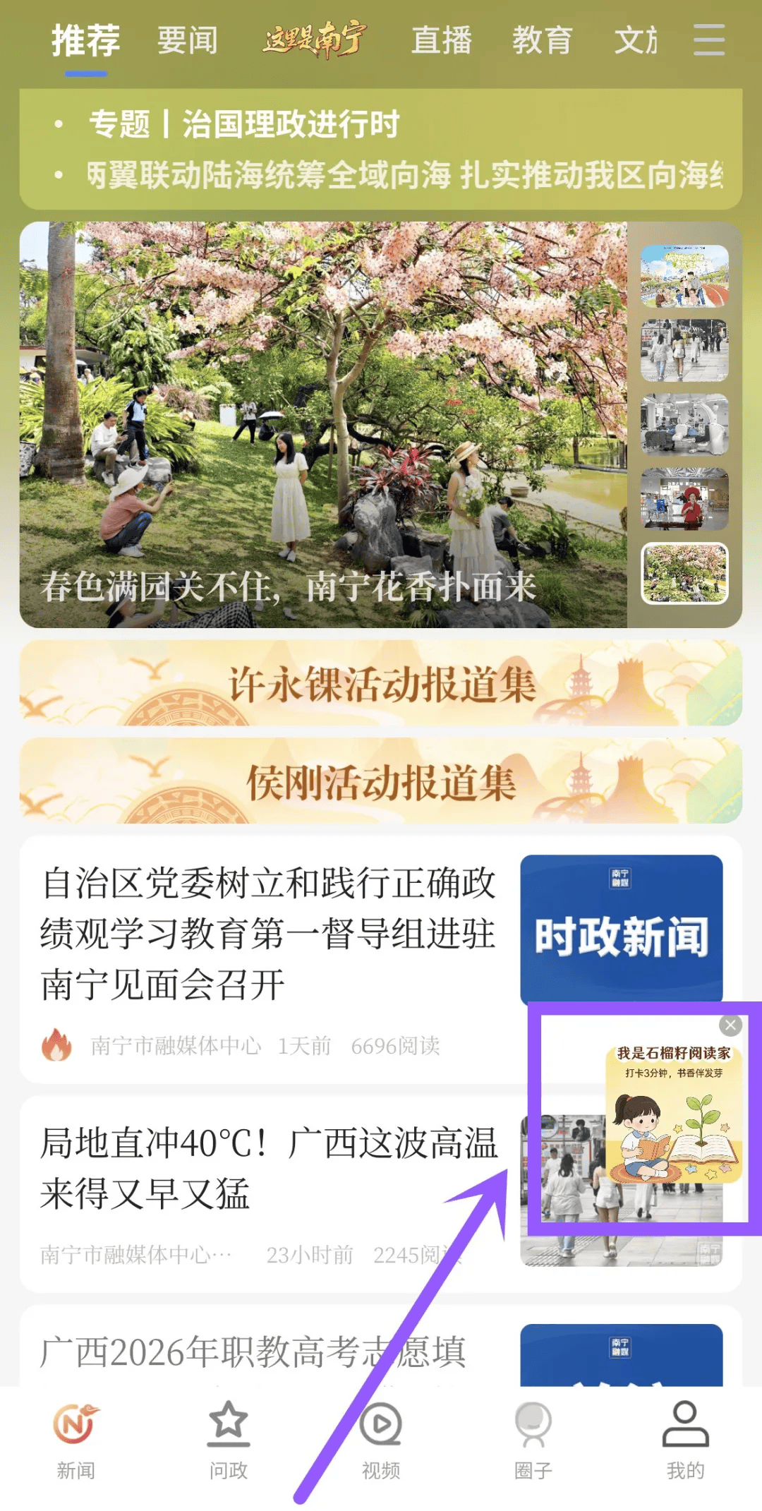 2.启动南宁云App,使用手机号完成注册登录,并在首页右下角点击“我是石榴籽阅读家”入口;